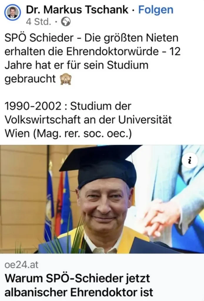 Mit der Ehrendoktorwürde darf sich Schieder, der bereits einen Magister führt, nun auch als „(Ehren)Doktor“ bezeichnen – was die FPÖ offenbar besonders ärgert.