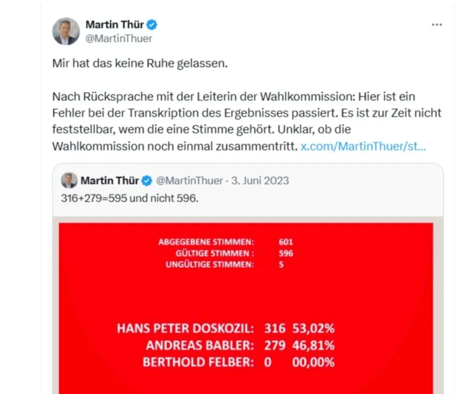 Zur Erinnerung: Während Hans Peter Doskozil im Juni 2023 bereits als neuer Parteichef gefeiert worden ist, deckte Martin Thür einen Rechenfehler bei der Wahl des Bundesparteivorsitzenden in Linz auf – sie musste dann wiederholt werden, und Andreas Babler war dann plötzlich die Nummer 1.