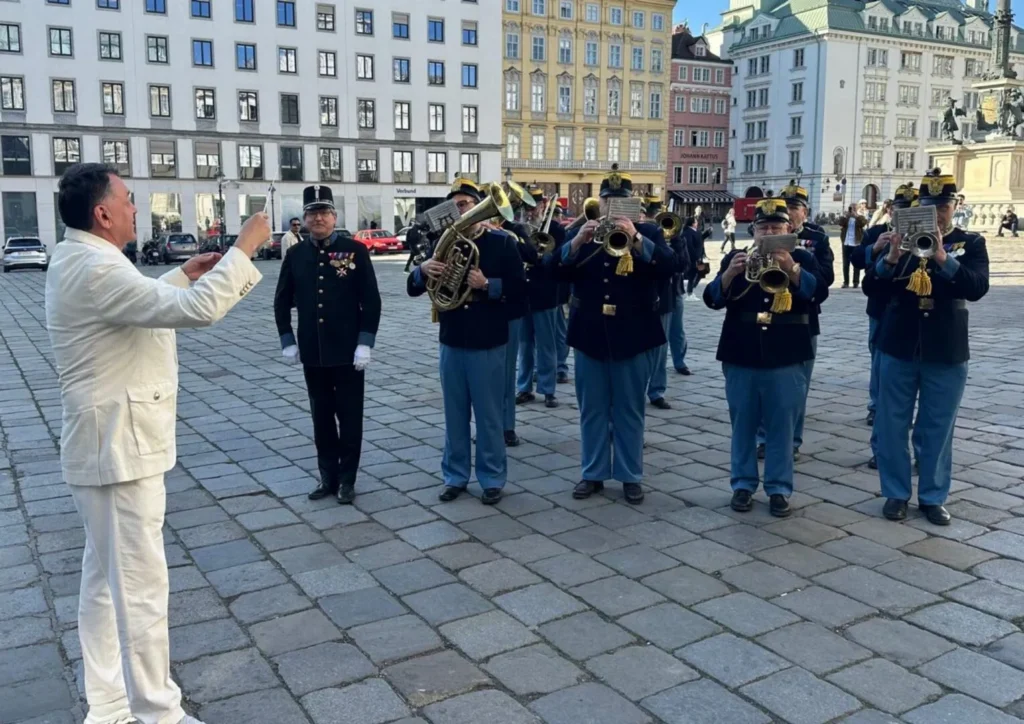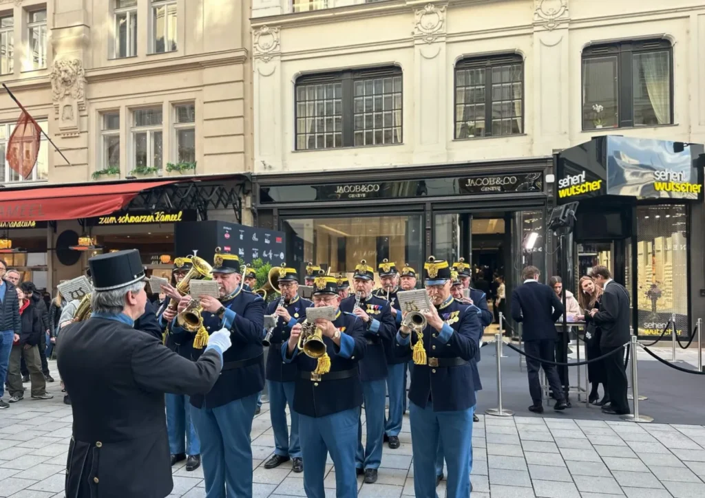 Ein besonderer Höhepunkt des Abends war ein Moment, der die Brücke zwischen internationalem Glamour und tief verwurzelter österreichischer Geschichte schlug: Der Auftritt der Original Hoch- und Deutschmeisterkapelle. Initiiert als persönliches Gastgeschenk von exxtra24 Herausgeber und Unternehmer Markus Posset an seinen Freund Jacob Arabo, verlieh die traditionsreiche Marschkapelle dem Event eine fast kaiserliche Aura. Die kraftvollen Klänge, geprägt von militärischer Präzision und historischer Bedeutung, setzten einen bewussten Kontrast zur modernen Extravaganz der Marke – und genau in diesem Spannungsfeld entstand die Magie des Abends.